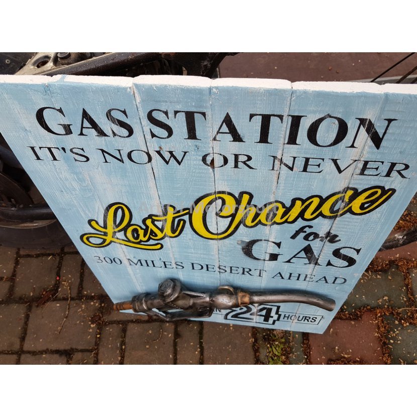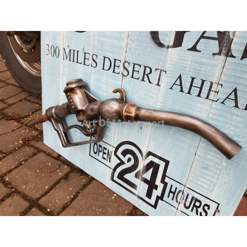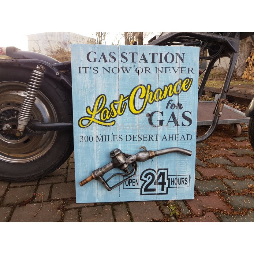 Velká cedule 70 x 55 cm z prken s plastovým odlitkem tankovací pistole.