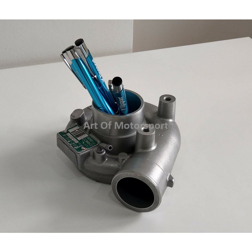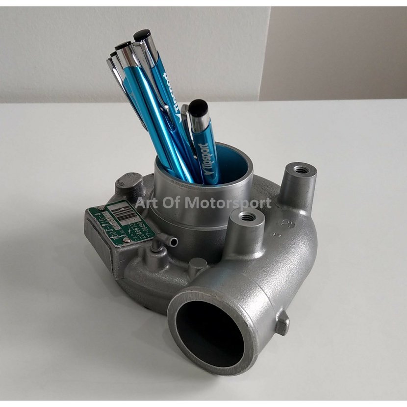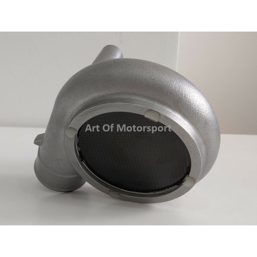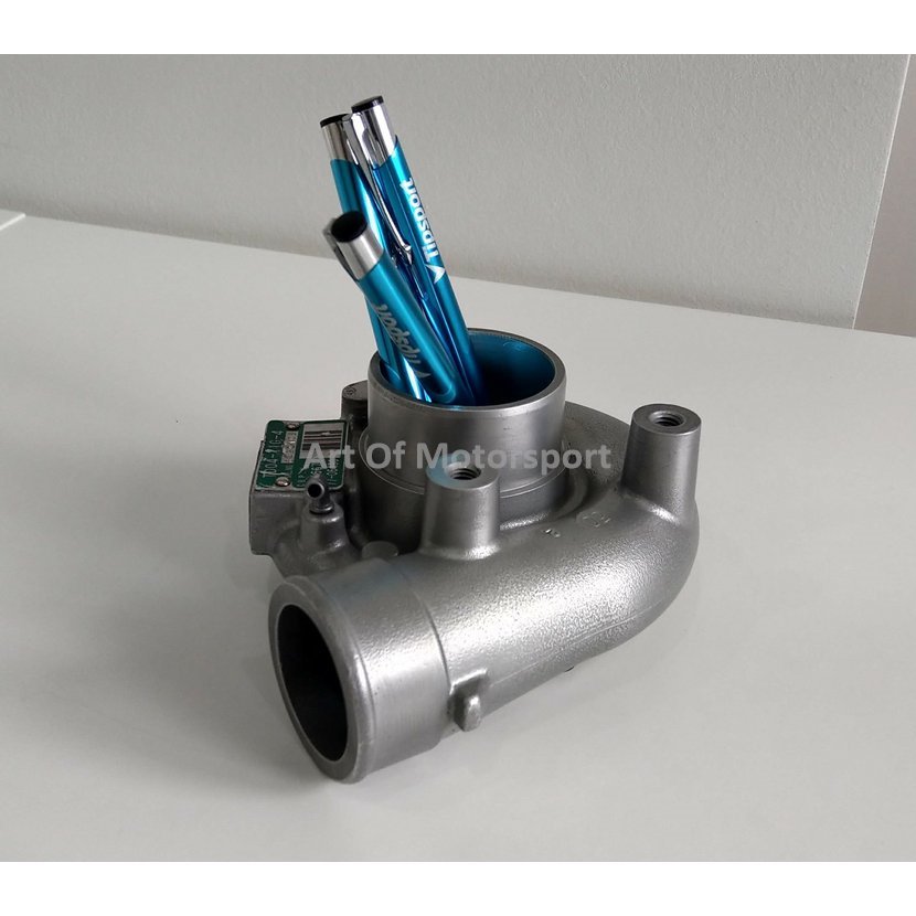Turbo z osobního vozu, které bylo přecizně očištěné, ručně obrobené pro větší otvor na propisky. Dno vyrobené z pravého carbonu.