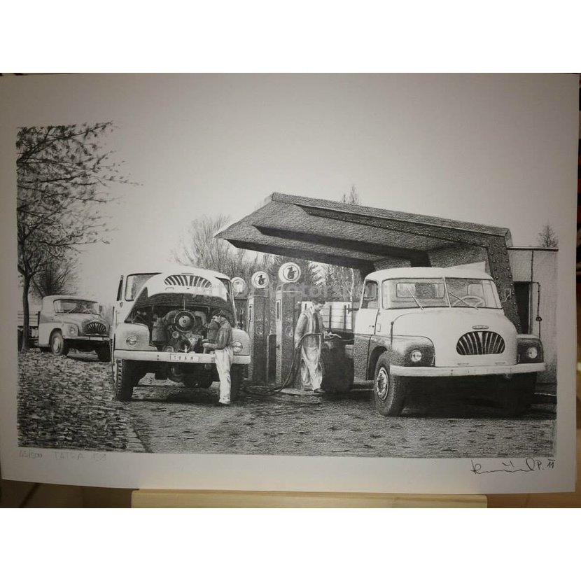 Kresba vozidla na speciálním krémovém papíru, který dodává obrázkům historický nádech.
