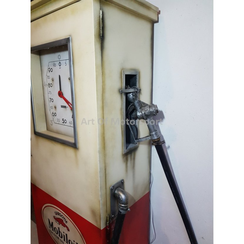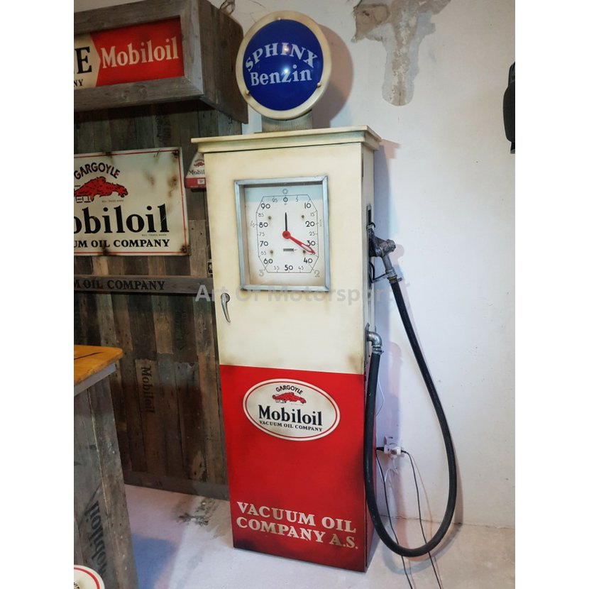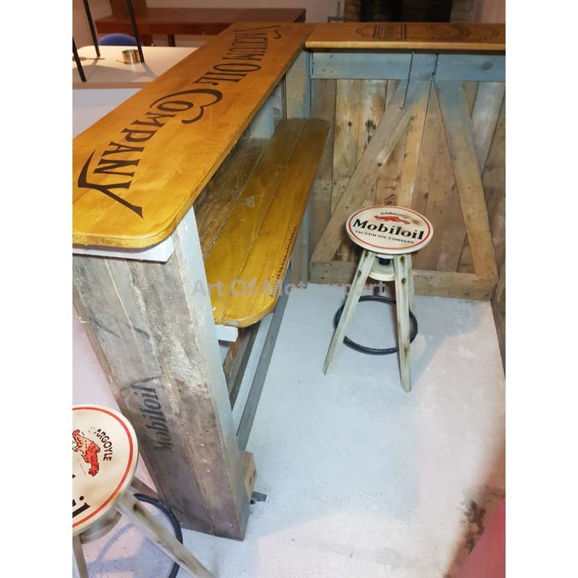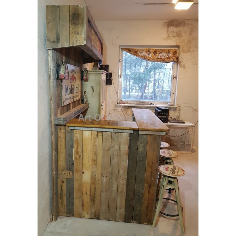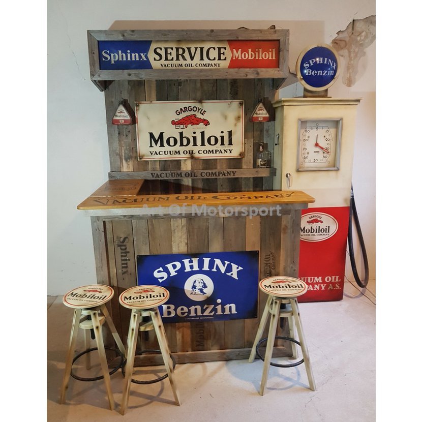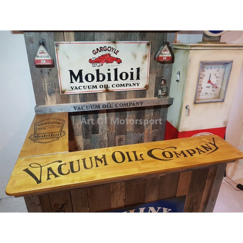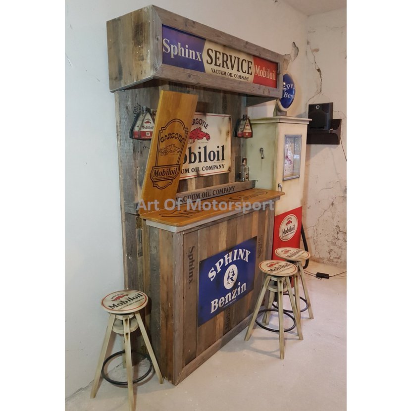 Cedule jsou nově pomalované plechy, světla (trojúhelníkové plechovky) a tankovací pistole jsou plastové odlitky. Bar staré dřevo, barová deska buk, mořená, lakovaná. Pumpa dřevotříska. Rozměry: šířka 221 cm, výška cca 225-235 cm (horní štít jde posouvat), hloubka složený 50 cm, vytažený 125 cm.