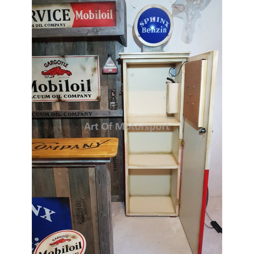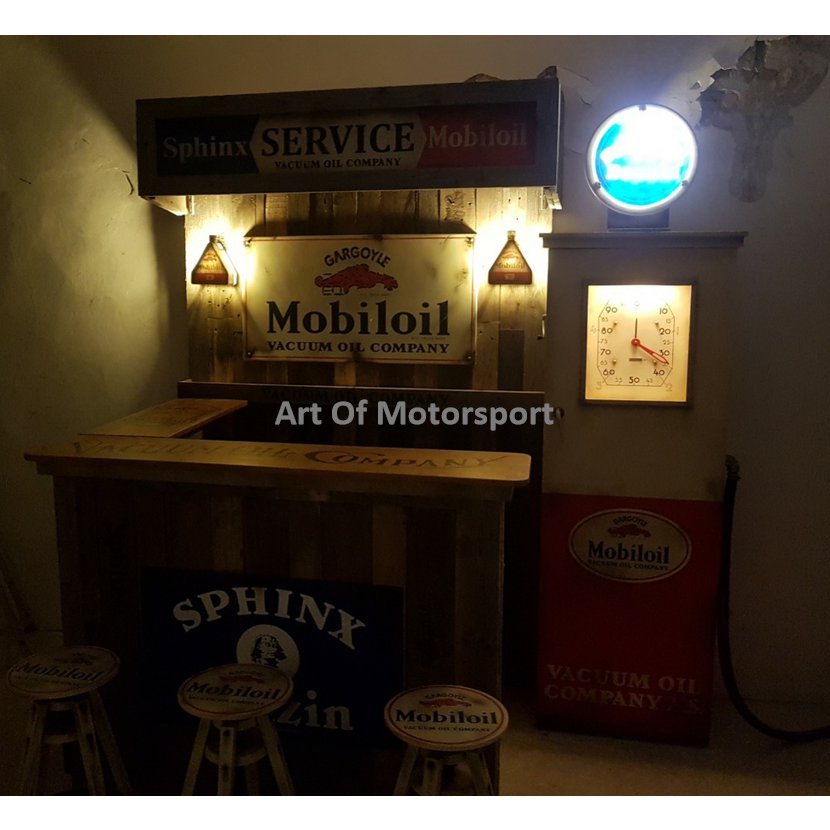 Skládací BAR do garáže Mobiloil Sphinx. Po přisunutí ke zdi zabere jen 50 cm. Bar, skříň jako pumpa, 3x stolička, osvětlení.